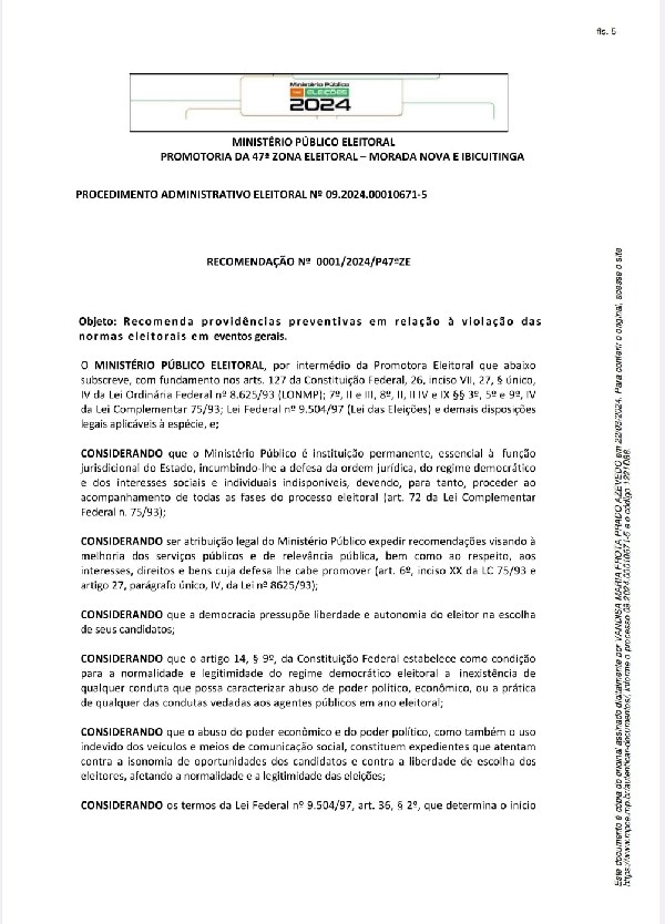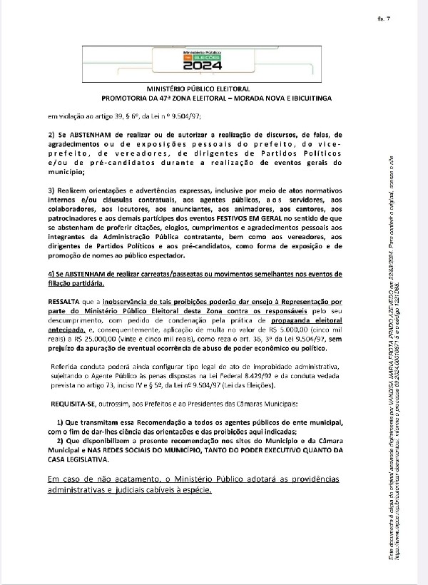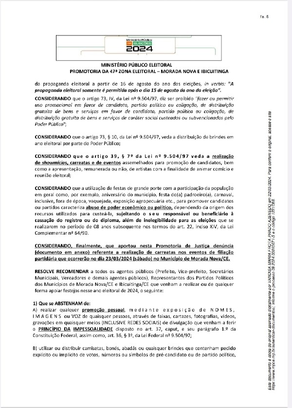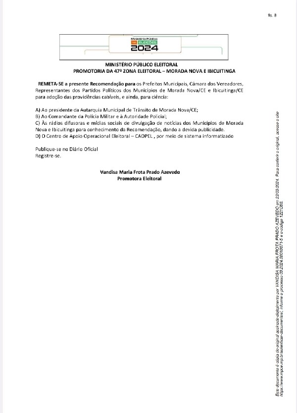 De ordem da Dra. Vandisa Maria Frota Prado Azevedo, Promotora de Justiça da 47ª Zona Eleitoral de Morada Nova/Ibicuitinga, encaminho, para fins de divulgação nas redes sociais, Recomendação Ministerial Eleitoral nº 0001/2024/P47ªZE, recomendando providências preventivas em relação à violação das normas eleitorais nos eventos de filiação partidária e demais eventos de caráter político, inclusive eventual infração a proibição de propaganda antecipada.