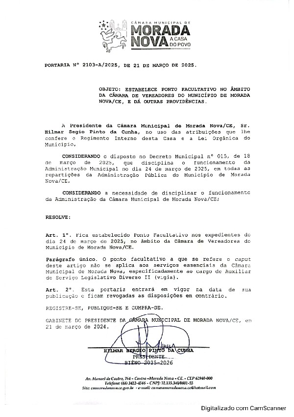 Estabelece ponto facultativo no âmbito da Câmara de Vereadores do Município de Morada Nova/CE, e dá outras providências.
